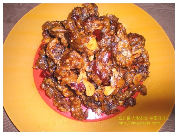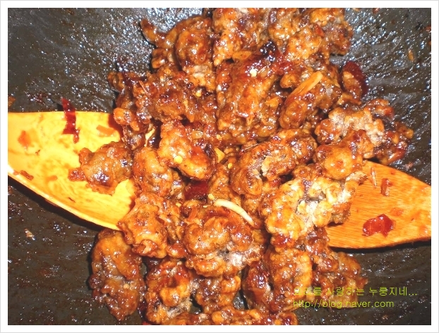 7. 소스가 약간 꺼룩해 지면 소고기 튀긴걸 넣고 재빨리 무쳐 줍니다.
