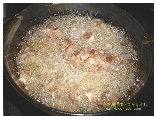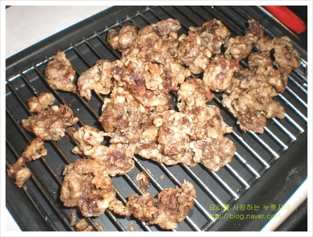 3. 소고기를 가루를 무쳐준뒤 반죽물에 넣어 기름에 튀겨 줍니다.(2번)