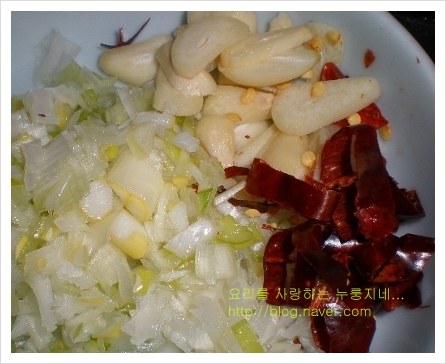 5, 대파는 흰부분으로 썰고 건홍고추와 마늘은 슬라이스 해 줍니다.