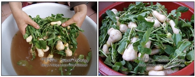 소금에 절여진 알타리무는 다시 흐르는 물에 두어번 깨끗이 씻어서