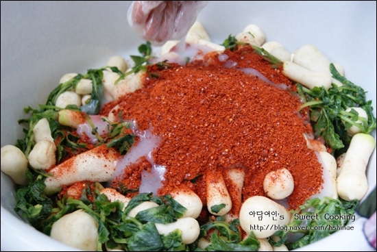 물기를 뺀 알타리무에 찹쌀풀과 고춧가루, 다진마늘과 생강,