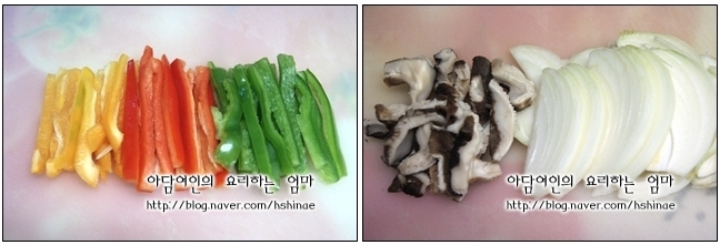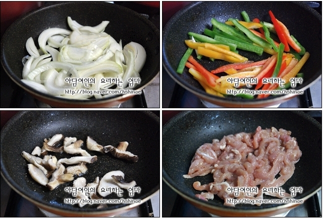 먼저 기름을 두른 팬에 양파, 파프리카, 불린 표고버섯을