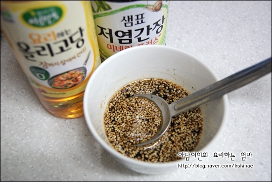양념장 : 저염간장 3큰술, 올리고당 1큰술반, 참기름 1큰술, 통깨 1큰술, 후춧가루 약간
