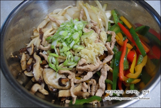 말린 묵 3줌, 잡채용 돼지고기 200g, 마른 표고버섯 1줌, 양파 1/2개, 색깔별 파프리카 1/4개씩다진 마늘 2/3큰술, 다진 파 1큰술, 돼지고기 밑간 : 저염간장 1큰술, 참기름 1/2작은술, 후춧가루 약간