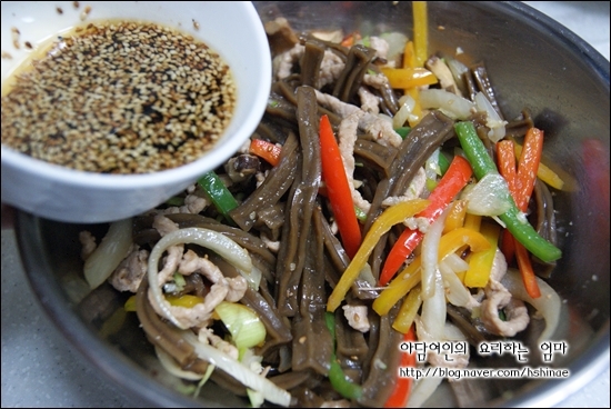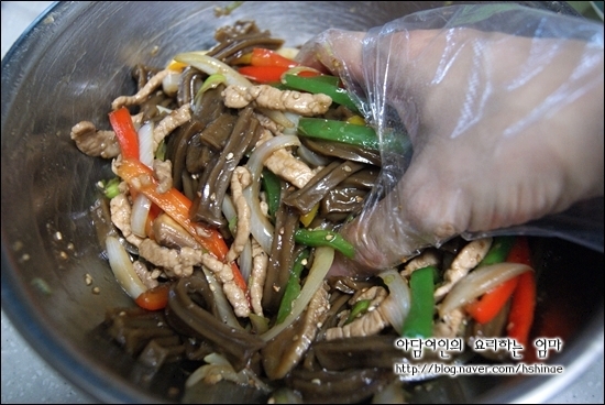 잘 섞여진 묵잡채에 준비된 간장양념장을 넣고 조물조물 무쳐주어요~