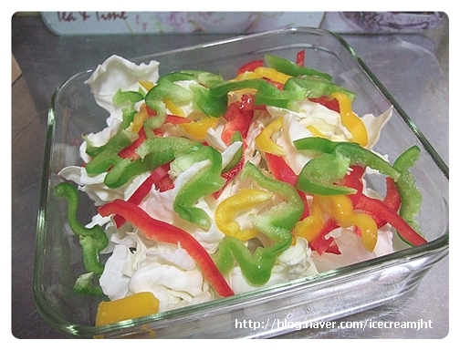 파프리카와 양파는 손질하여 깨끗이 씻은후 물기를 빼고 적당한 크기로 썰어준다