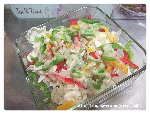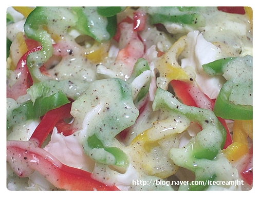 그릇에 파프리카와 양배추를 담고 드레싱을 끼얹어준다