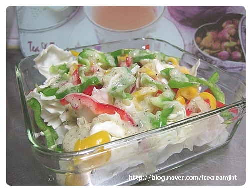 각종야채, 키위우유드레싱, 파프리카, 양배추 드레싱 (키위 1개, 다진양파 1큰술, 우유 1/4컵, 레몬즙 2큰술, 설탕 1큰술, 소금, 후춧가루)