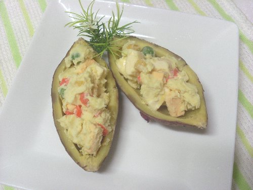 고구마는 삶아서 반으로 잘라 속을 파내어 줍니다.