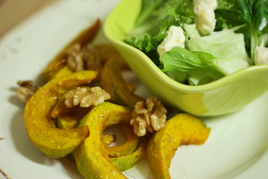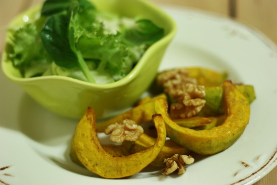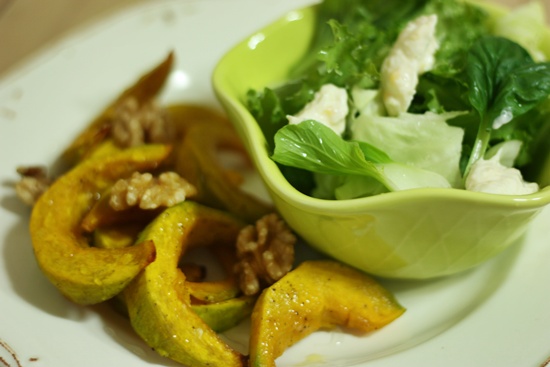 재료: 단호박 반개, 샐러드채소 한줌, 호두 적당량