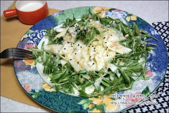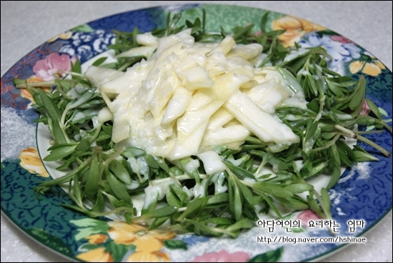 다소 밋밋한 맛일 수 있는 돌나물에 아삭한 사과와 상큼한 요구르트 드레싱이