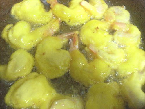 새우는 튀김가루에 치지물을 넣은 반죽에 넣은후
