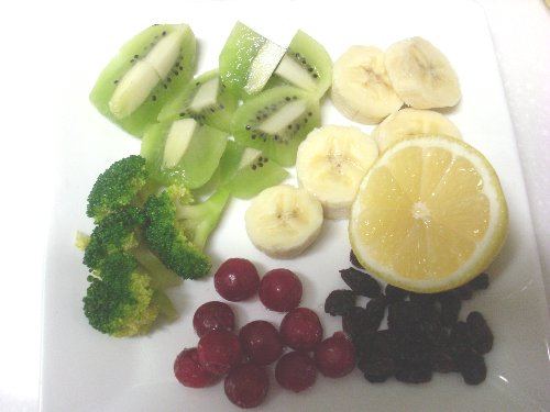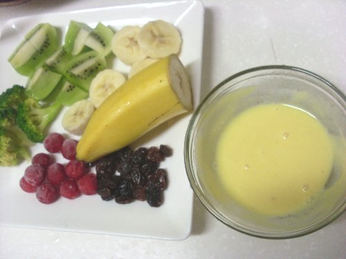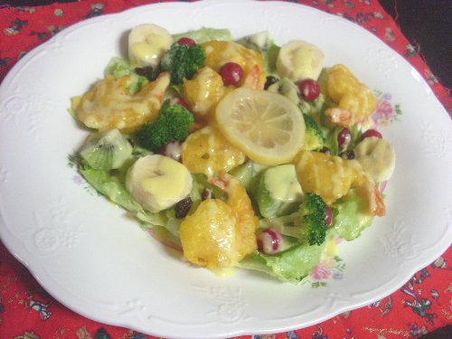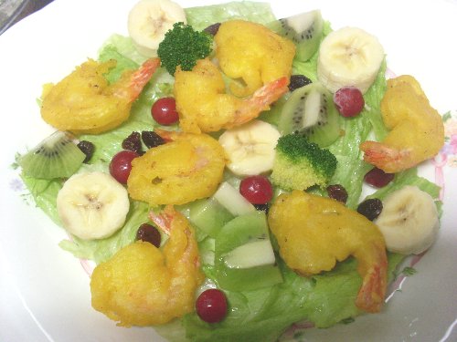 칵테일새우,튀김가루,치자물,브로콜리,바나나,양상추,건포도,키위,앵두 , 드레싱-머스타드2큰술,생크림2큰술,레몬꿀절임국물2큰술,레몬즙2큰술