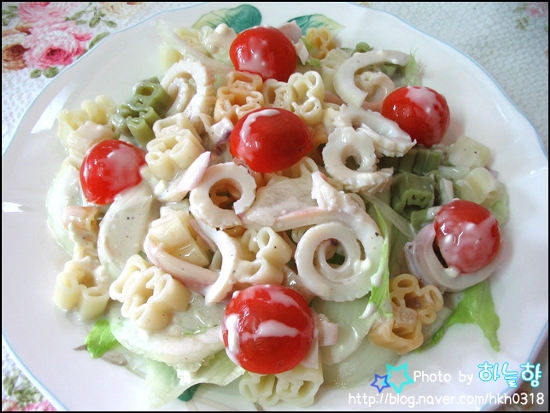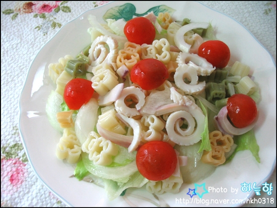 파스타, 오징어, 양상추, 양파, 방울토마토, 두유 소스