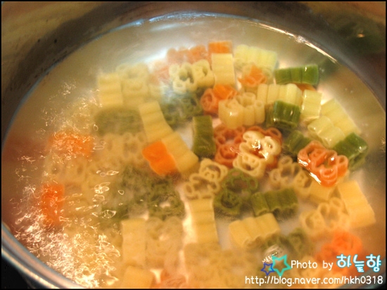 소금 넣고 끓은 물에 곰돌이 모양 파스타를 넣고 익힙니다.