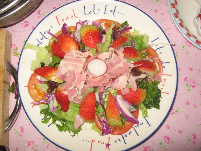 양상추, 자색양배추, 양파, 오이, 토마토, 딸기, 각종 샐러드용 잎채소, 발사믹식초 4T, 올리브유 4T, 레몬즙 1T, 올리고당 1T, 소금, 후추 약간