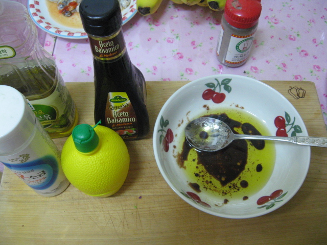 발사믹식초 4T, 올리브유 4T, 레몬즙 1T, 올리고당 1T, 소금, 후추 등