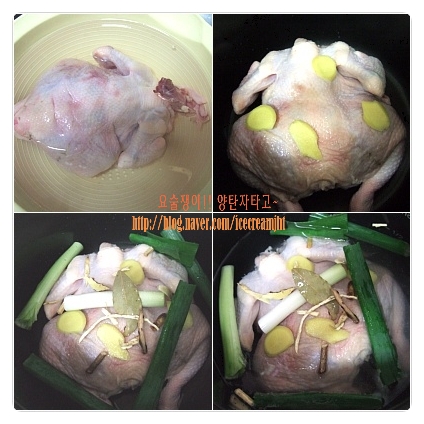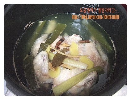 닭은 미리 찬물에 담구어 핏물을 제거하고, 솥에 담고 생강, 대파, 월계수잎, 화이트와인을 넣어준다