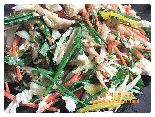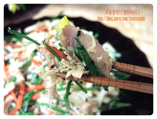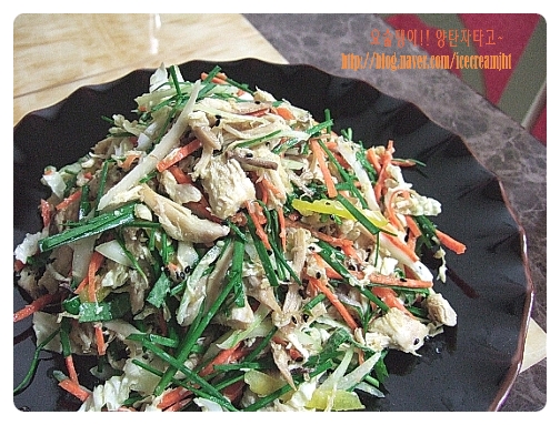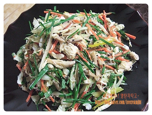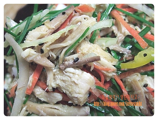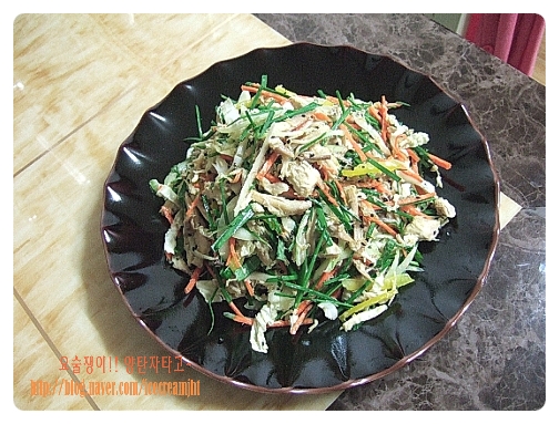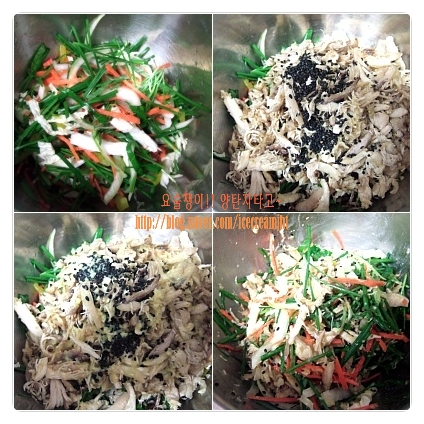 볼에 채썬 채소를 모두 담고 볶은 닭고기도 넣어준다