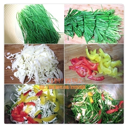 부추는 깨끗이 씻어 적당한 길이로 썰어주고, 양배추와 파프리카도 채썰어 준비한다