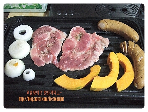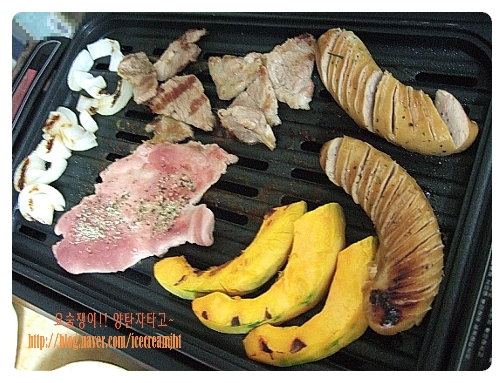 구이판에 돼지고기와, 양파, 단호박, 허브소세지까지 골고루 올려서 노릇하게 구워준다