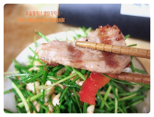 부추, 돼지고기, 부추, 홍.노랑 파프리카, 양배추, 허브소세지