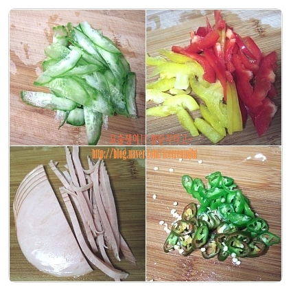 슬라이스햄도 채썰고, 풋고추는 송송 썰어 준비한다