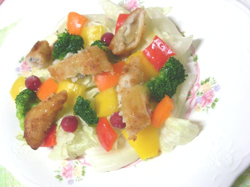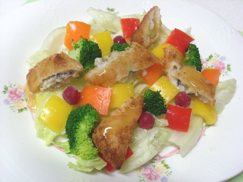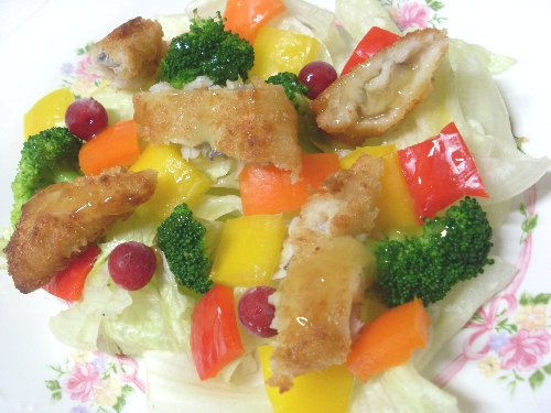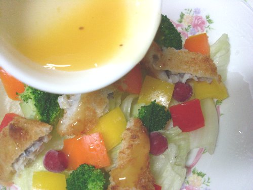 생선까스를 자른후 샐러드위에 올리고 소스를 뿌려주면 완성입니다.