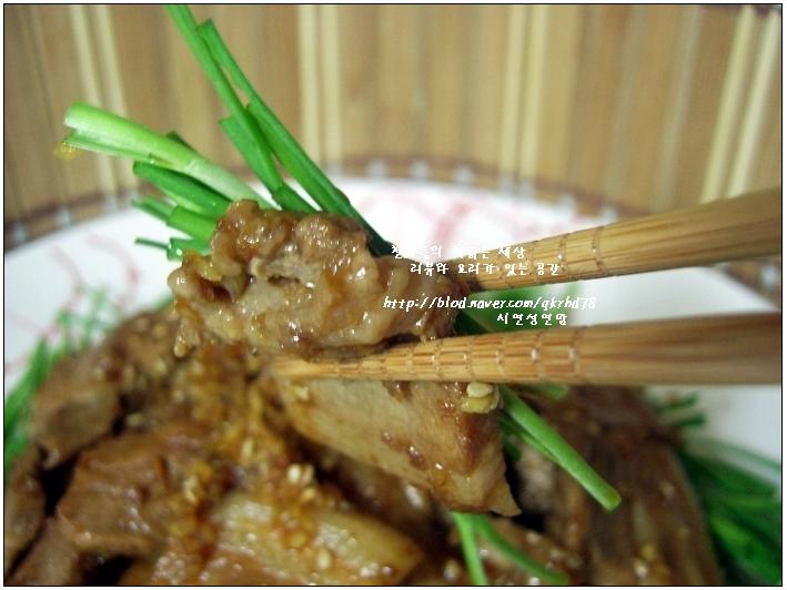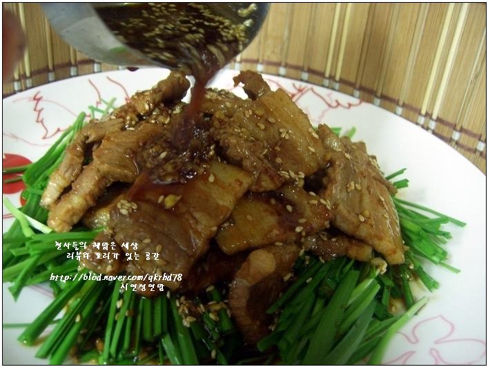 그리고 마지막으로 또하나의 간장양념을 끼얹어 부추에도 소스가 스며들도록 하는데요.