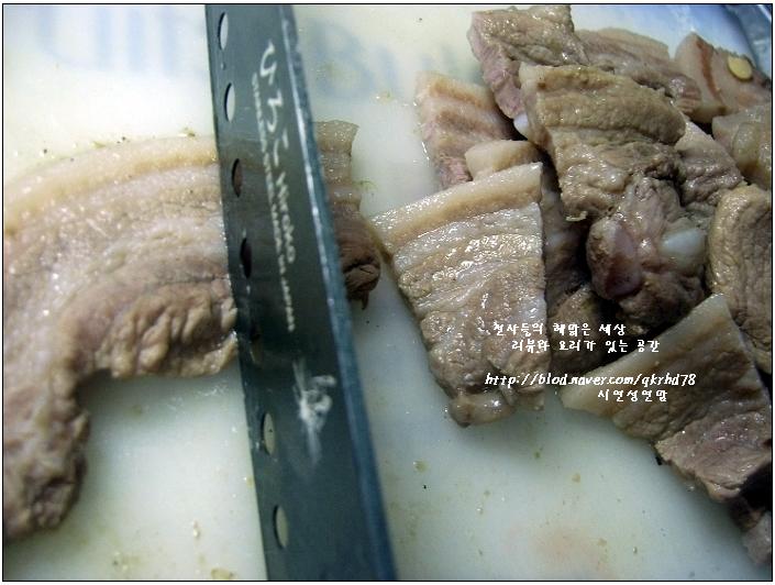그렇게 잘 삶아진 삼겹살은..먹기 좋은 크기로 썰어주시구요.