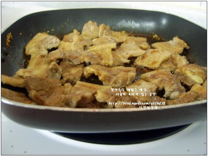 양념장과 잘 버무린 삼겹살은.. 팬에 올려 약한불에서 양념장을 끼얹어가면 살짝만 조려줍니다.
