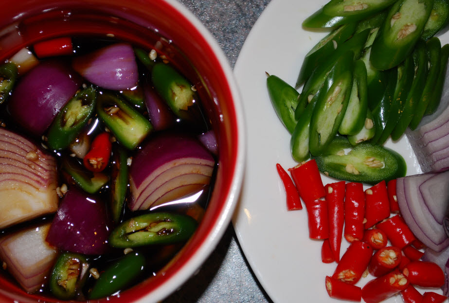 포도씨유 150g, 진간장 150g, 식초100g, 꿀150g, 청양고추 5개(청양고추가 없을 땐 칠리를 이용), 양파 중간크기 1개 , 빨, 주, 노, 초 피망 각1/2개, 양상추 등 제 철 채소