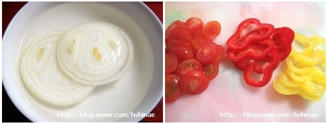 얇게 둥글게 슬라이스한 양파는 찬물에 잠시 담궈 매운맛을 제거하고
