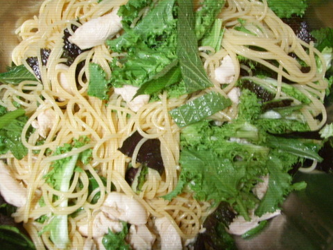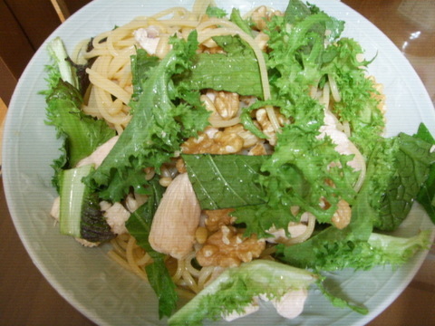 스파게티, 닭가슴살, 샐러드용 채소, 견과류