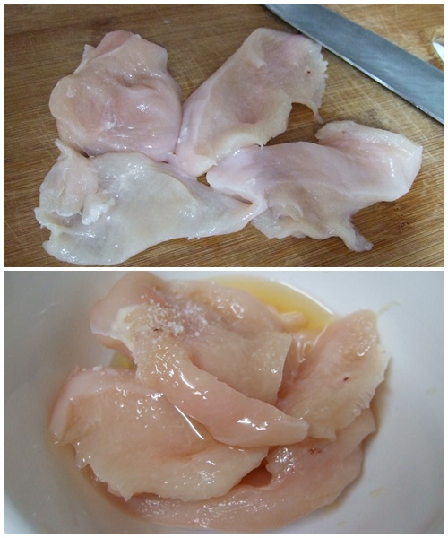 1. 닭은 칼등으로 살짝 두들기셔서 소금, 후추 약간넣고, 청주넣고 재워주세요.