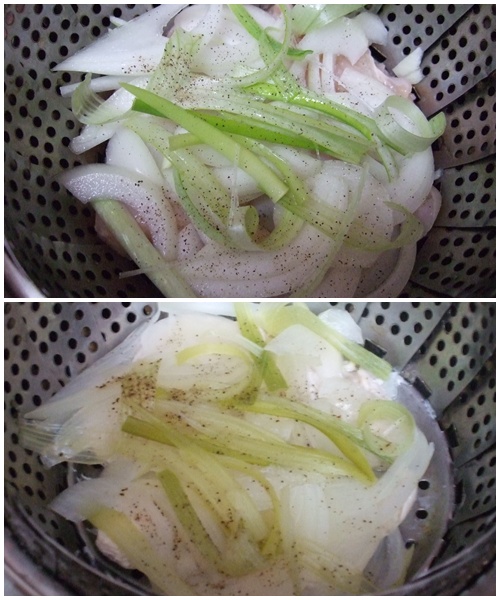 닭가슴살, 양배추, 대파 순으로 올려서 후추 약간 뿌려서 찌세요.