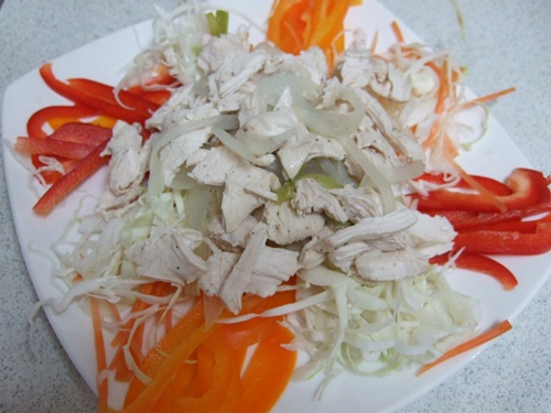 2. 야채는 채썰으셔서 이쁘게 담은 후 위에 닭가슴살, 양파, 대파를 살짝 섞어서 올려주세요.