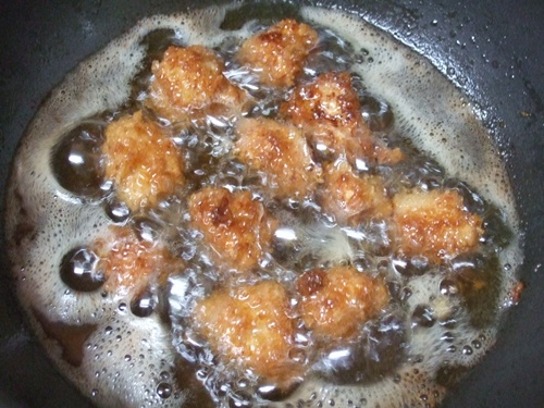 빵가루를 입힌 후 퐁당~ 튀겨주세요.
