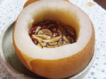 2.배는 위 뚜껑을 자르고 속을 파낸후 잣을뺀 재료를 모두 담아줍니다.
