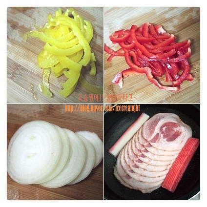 홍.노랑 파프리카는 가늘게 채를 썰고, 양파는 모양을 살려 동그랗게 썰어줍니다