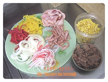 참치캔, 통조림햄, 참치캔, 통조림햄, 홍.노랑파프리카, 양파, 롤베이컨, 맛살, 캔옥수수