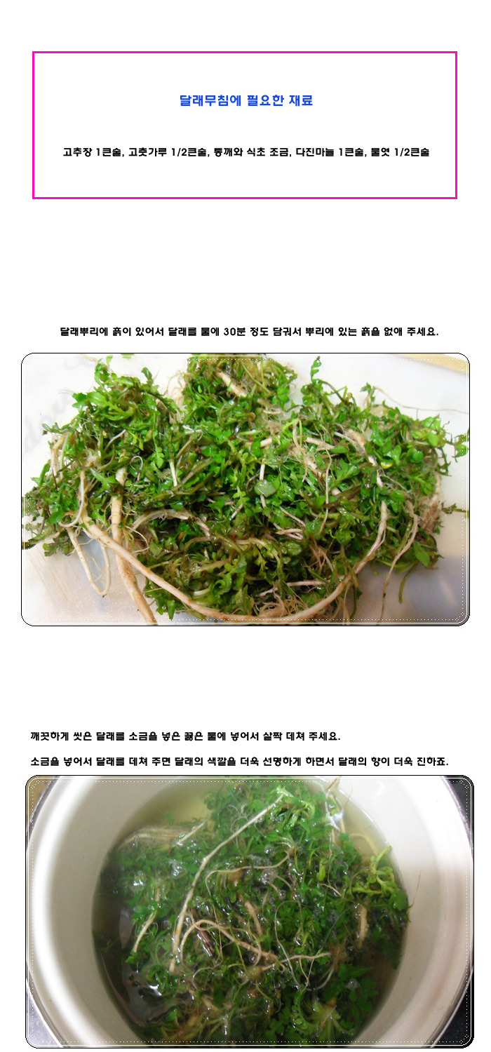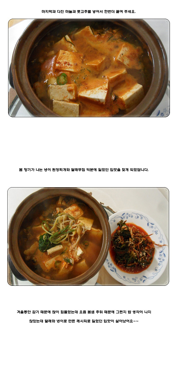 달래, 우렁이, 냉이, 두부, 고춧가루,다진마늘, 고추장, 물엿, 식초, 통깨, 풋고추, 된장,멸치