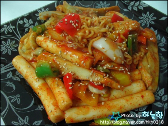 라면, 피망, 양파, 대파, 당근, 만두, 어묵, 떡, 케찹, 고추장, 간장, 설탕, 요리당, 고춧가루, 후추, 깨소금
