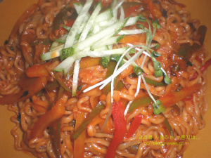 라면 2봉, 피망, 양파, 파프리카, 오이, 무순, 소스 만들기(고추장 1/2큰술, 굴소스 1큰술, 간장 1/2큰술, 고추기름 1큰술, 설탕 1큰술,참기름 1큰술)