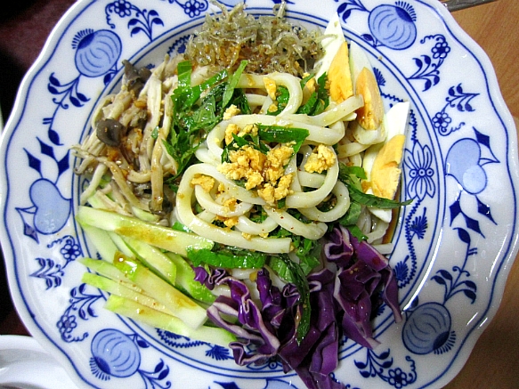 멸치와 버섯을 곁들인 냉우동 샐러드~
