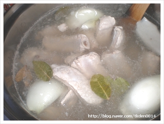 끓는물에 생강편, 월계수잎, 양파, 대파등을 넣고 우르르 데쳐 냅니다.