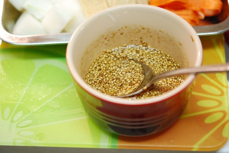 , 간장 4큰술, 설탕 1큰술, 통깨 2큰술, 다진마늘 2작은술, 참기름 2작은술, 후춧가루 약간