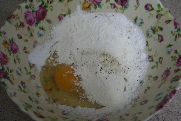 볼에 달걀하나에 튀김가루와 전분을 반반넣고, 허브소금 살살뿌려 차가운물한컵과 반죽해 둡니다.