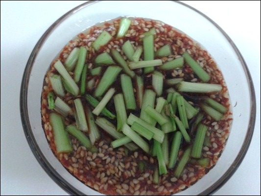 고춧가루2,간장5,참기름1, 설탕0.2, 깨소금1, 미나리 약간을 넣고 양념장을 만들어주세요
