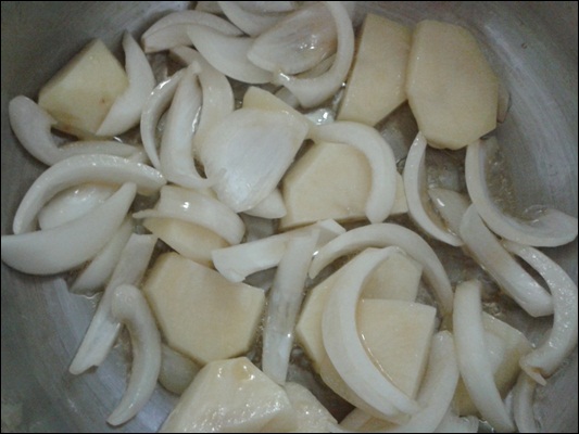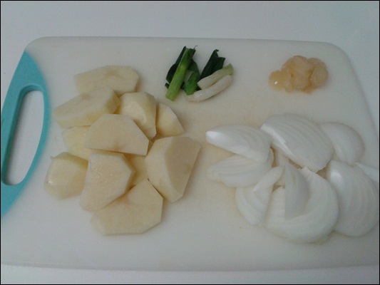 감자는 큼직하고 0.5cm두께로 썰고 양파는 채썰고,